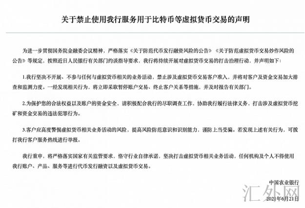 星期一(6月21号)14:30,中国农业银行公布有关禁止运用该行服务用于比特币等虚拟货币交易的声明:我行坚决不开展、不参与任何与虚拟货币有关的业务活动,禁止涉及虚拟货币交易客户准入,并会对客户及资金交易加大排查和监测强度...