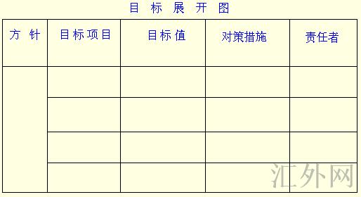 什么是目标展开图 目标展开图是直观形象的表明并清晰目标与目标责任的图表。编制目标展开图是目标展开的最后一个环节,适用图表形式将目标和达到目标的对策的等首要内容发布于众,便于...