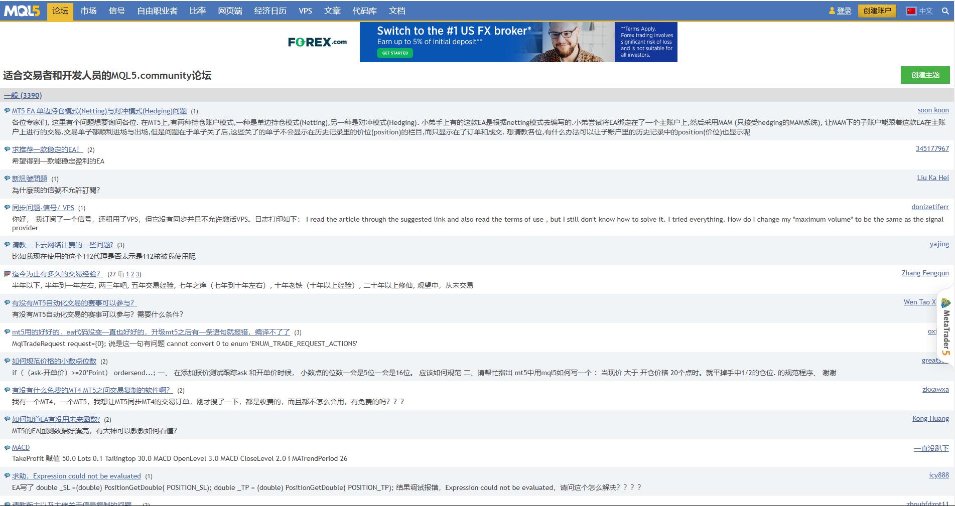 它还为所有访问者提供自由沟通和讨论问题的机会,这些问题关于MetaQuotesLanguage5(MQL5)和MetaQuotesLanguage4(MQL4)编程、交易、自动交易系统、策略测试和MetaTrader5和MetaTrader4技术指标的使用等。