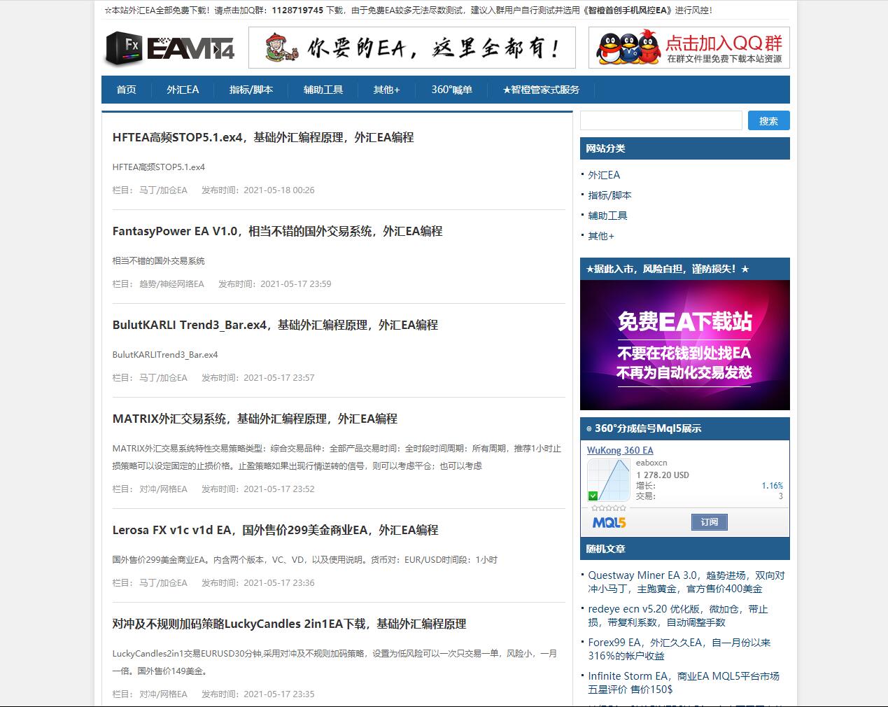 在EA下载区,您可以下载多种类型的EA:马丁EA,网格EA,对冲EA,趋势EA,头皮EA,神经网络EA,套利EA,水平/等级EA,新闻EA,多货币EA,多策略EA等。在工具下载区,您可以下载多种类型的交易工具:脚本,跟单EA软件,统计分析,面板,风控EA,复盘软件,半自动EA等。在指标下载区,您可以下载多种类型的指标:趋势指标,震荡指标,通道,水平/等级,形态指标,多周期指标,多货币指标,柱状图,功能等。以及其他外汇交易电子书,开发文档,历史数据,外汇软件,EA参数等。