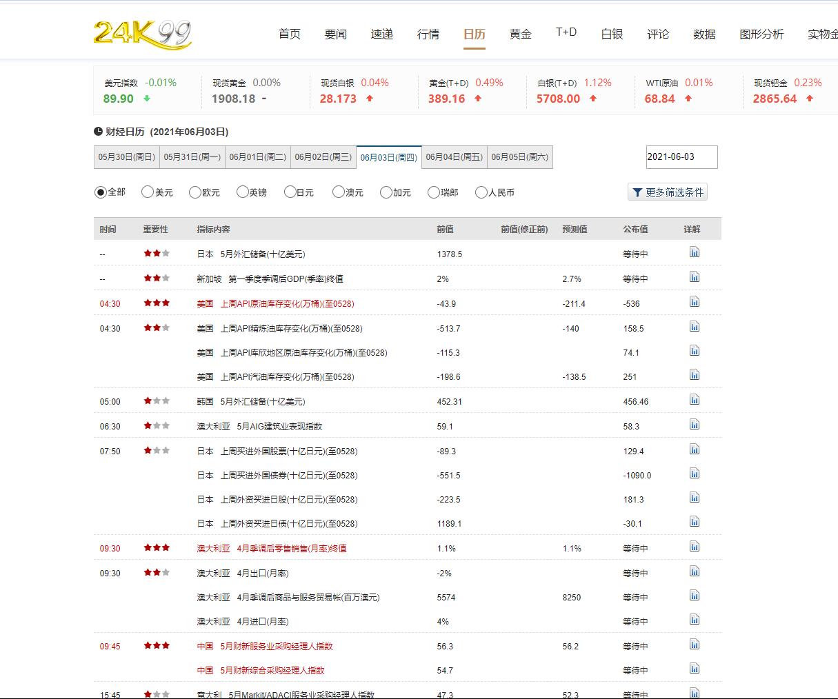 24K99财经日历频道,实时提供CPI、PPI、GDP等大量图表数据,更有财经日历(月历)、财经周历、美国及各国经济指标等重要数据。
