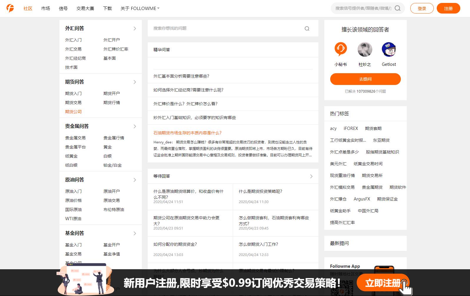 Followme交易社区交易问答频道提供外汇贵金属交易入门知识、期货交易、投资交易技巧、交易行情策略等行业知识问答,汇集20万行业投资交易用户经验技巧,快速解决投资交易中的疑难问题,帮助大家更好进行交易解惑